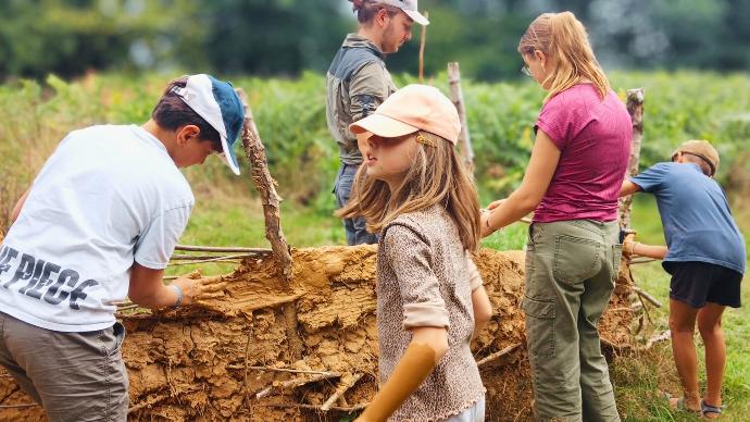 À l’Étinbulle les participants découvrent par l’action pour apprendre au contact de la nature. Ils testent, expérimentent, réalisent en mettant en œuvre des matériaux et des savoirs faire naturels remontant parfois à la Préhistoire.