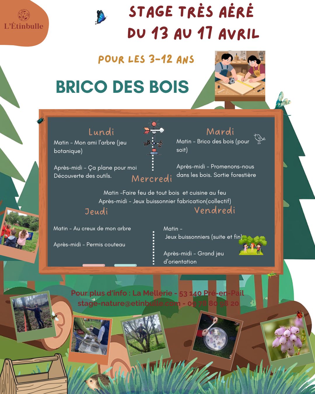 5 journées pour les 3-12 ans en plein air de 7 h 30 à 18 h 30 sur le thème "Brico des Bois"