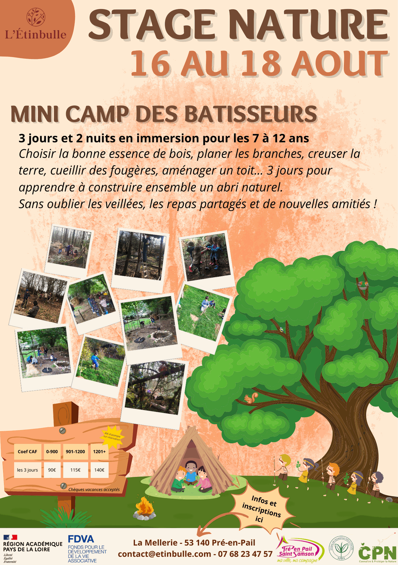 Le stage nature se déroule du 16 au 18 août, à la journée avec nuitées sous la tente. Le mini-camp s'adresse aux enfants de 8 à 12 ans sans leur parents.